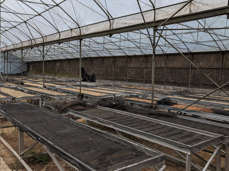 ④アフリカンベッドの上で、水分値が25%程度になるまで一次乾燥を行い、脱殻、その後生豆の状態で乾燥させていきます。乾燥中、風味を出すために食用エッセンスをふりかけ、最終的に水分値が11.5から12%程度になるまで乾燥させます。